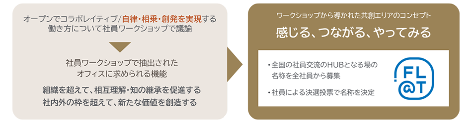 FL@Tでは、特定の組織に閉じた検討ではなく、社員全員が関わるプロセスを採用しました。目的とした「自律・相乗・創発を実現する働き方とはどのようなものか」「そのために何が必要か」を議論するため、社員ワークショップを開催し、その内容をオフィス計画の与件に反映させています。
