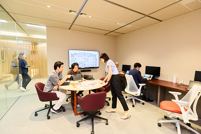 加えて、「組織間の壁を越える」という思想も空間づくりに取り入れました。これまでは組織ごとにクローズドな空間で業務を行うことが多く、建築・総務・研究開発などの部門間では、異なる専門性を持つ人材同士が自然に交わる機会はほとんどありませんでした。