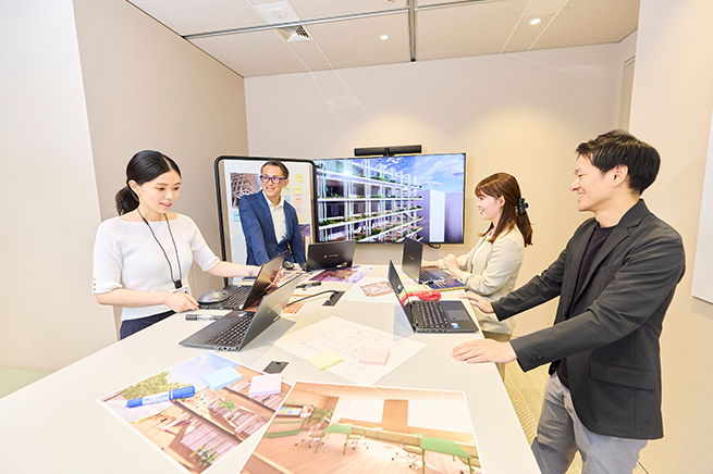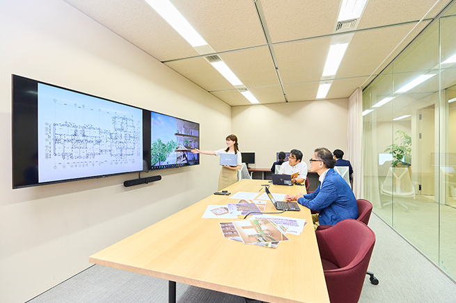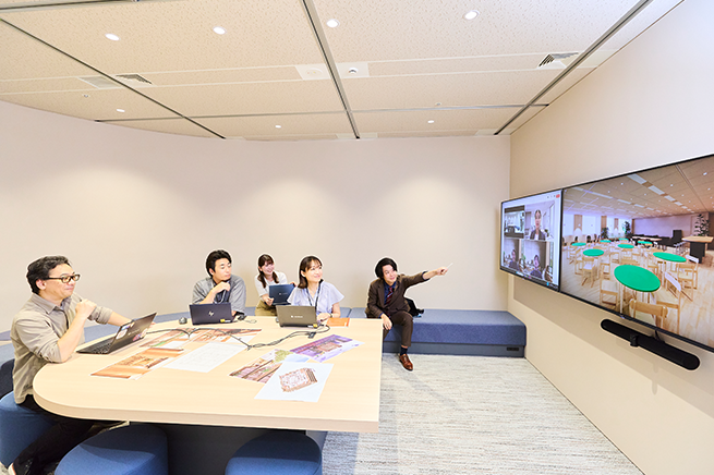 ICT面では、全ての部屋にモニター・カメラ・マイク・スピーカーを標準装備しました。ハイブリッド会議で参加者全員の顔が均等に映る設備を整えることで、全員が一体感を持って議論に加われるようにしています。