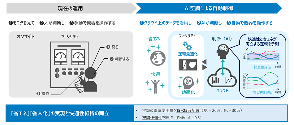さらに、研究開発部門では「快適性を保ちながら省エネを実現する」というコンセプトのもと、AI空調制御システムを開発しました。AI空調制御では、BASやBEMSから集まるデータをクラウド上に集積し、快適かつ最適な空調設定温度をAIが自動的に計算し制御します。属人的かつ感覚的になりがちな温度設定を排除し、快適性と省エネ性を両立する仕組みです。例えば、過剰な温度設定によって発生する無駄なエネルギー消費を抑制し、合理的な運用へと導きます。