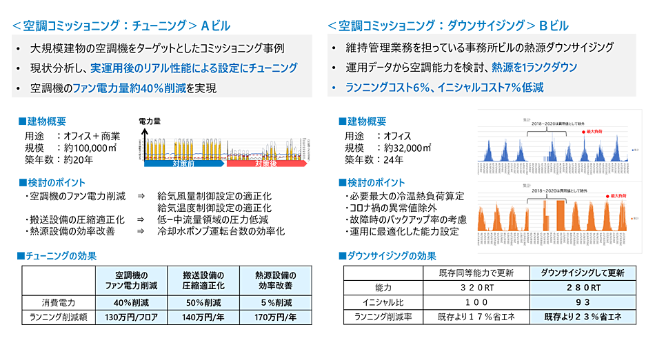 また、北海道エリアの当社が維持管理業務を担う施設(下図Bビル)では、熱源設備の更改タイミングに合わせてコミッショニングを提案し、データ活用に基づくダウンサイジングを実現しました。